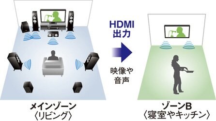 寝室やキッチンで映画や音楽の続きが楽しめるゾーンB対応HDMI出力