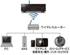 家庭内ネットワークへ無線LAN経由で接続できるWi-Fi機能を内蔵し、インターネットと接続した無線LANルーターの電波が届く範囲ならLANケーブルを接続しなくても、ネットワークオーディオや「AV CONTROLLER」でのワイヤレス操作を実現。無線LANルーターとの接続はWPSで簡単に行うことができ、多彩なネットワーク機能をより手軽にお楽しみいただけます。