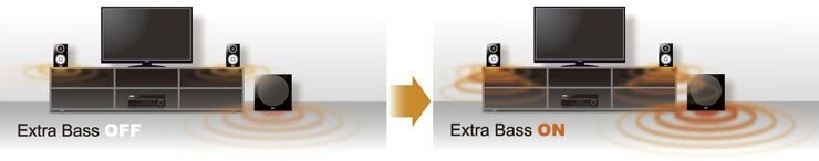 メイン(フロント)チャンネルにコンパクトスピーカーを使用する場合や、サブウーファーなしのシステム構成でも有効なExtra Bass(エクストラベース)を搭載。重低音の力感や躍動感をより手軽に味わえます。