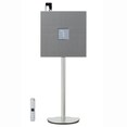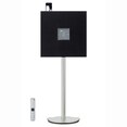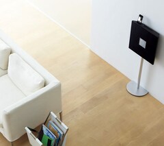 棚などが少ないシンプルモダンなリビングでも、置き場所を選ばないよう自立式にこだわりました。円形のスタンド底面は、半円状にもでき壁ぎわへの設置が可能です。電源コードはスタンド内を通して底面から引き出せるため、すっきりと配線できます。