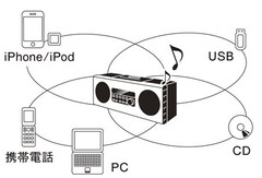 充電機能も備えたiPhone/iPodドックを搭載。いつもはイヤホンで聴いている曲を、豊かなサウンドで満喫できます。また、FM/AMラジオやCDはもちろん、USBメモリーに保存したMP3やWMAなどの音楽も再生できるUSBポートを本体前面に装備。加えて外部入力端子も装備し、接続した携帯電話やパソコンなどの曲をよりいい音で快適に楽しめます*。さらに、通常のビープ音のほか、お好みの音楽ソースをアラーム音として選択できるクロック機能を内蔵しました。音楽とビープ音を組み合わせたモードでは、ビープ音が鳴る設定時刻の3分前から曲を再生し、ゆっくりとボリュームアップ。快適な目覚まし時計としても使える、まさにオールインワンのオーディオシステムです。