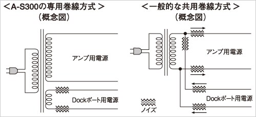 別売のiPod用ユニバーサルドック「YDS-12」を使用してお手持ちのiPodやiPhoneの音楽をより良い音で手軽に楽しめる、新設計の専用高音質Dockポートを装備しました。iPodなどからのアナログ音声信号(アンバランス)とGNDを本機内部でバランス受けして増幅処理することで、グラウンドラインを巡って外部から侵入する電源系ノイズやデジタル系ノイズを打ち消し、低歪みでクリアな再生音を獲得。さらに、Dock端子用の電源は専用のトランス巻線およびレギュレーターを設けた独立電源回路から供給し、iPodなどの再生中や充電中においても本機への音質的影響がないよう入念に配慮しています。また、このDockポートはiPod用ワイヤレスシステム「YID-W10」の接続にも対応し、お手持ちのiPodなどをワイヤレス再生できます。