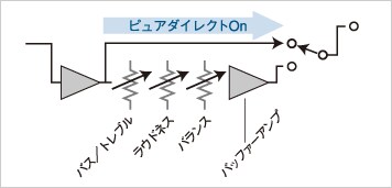 トーンコントロール(バス/トレブル)、ラウドネス、バランスの各コントロール回路と後段バッファーアンプをバイパスして全入力での音質向上を実現するピュアダイレクトスイッチ。信号経路を最短化して音の純度を高め、音楽の微妙なニュアンスまでも再現します。