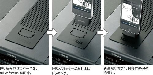 iPodに付属のトランスミッターを装着するだけで、iPodのサウンドをワイヤレス再生。本機の電源ON/OFFやボリューム調整もiPodから操作できるので、iPodがリモコン感覚で楽しめます。また、音声と映像のズレがほとんどないため、アプリやゲームを楽しむ際もストレスフリー。さらにトランスミッターを装着したままiPodを本機にドッキングすると、充電も行えます。