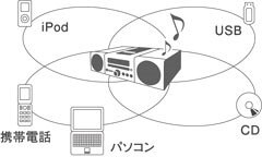 本体前面にUSBポートとステレオミニジャックを装備。USBメモリーのほか、携帯電話やパソコンをケーブルでつなぎ*、ダウンロードした曲も再生できます。もちろんCDやFMラジオにも対応。iPodのみならず多彩な音楽ソースをコンパクトな1台で楽しめます。