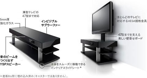 リアル5.1ch再生を本体1台で実現する専用設計YSPと、豊かな低音を再生する専用サブウーファーを内蔵。A-YST II方式を採用したA-YSTインビジブル・サブウーファーは「インビジブル」(不可視)の名称どおり、正面から見てもサブウーファーの存在を感じさせない美しい外観と、迫力ある本格的な重低音を両立しています。