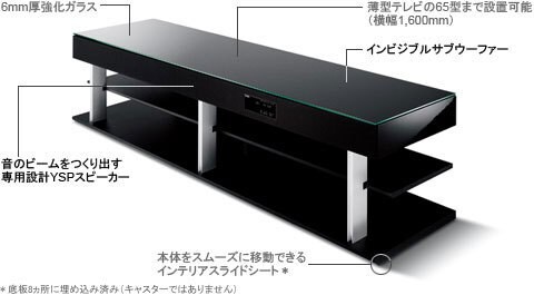 リアル5.1ch再生を本体1台で実現する専用設計YSPと、豊かな低音を再生する専用サブウーファーを内蔵。A-YST II方式を採用したA-YSTインビジブル・サブウーファーは「インビジブル」(不可視)の名称どおり、正面から見てもサブウーファーの存在を感じさせない美しい外観と、迫力ある本格的な重低音を両立しています。