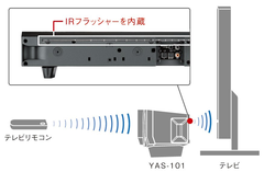 テレビリモコンの信号を伝送するIRフラッシャーをボディに内蔵(特許出願中)。テレビのリモコン受光部を覆うように本機を設置しても、電源ON/OFFや音量調整といったテレビリモコンからの信号はテレビへと転送されます。受光部が低い位置にあるテレビの前にも、安心して設置できる便利な機能です。