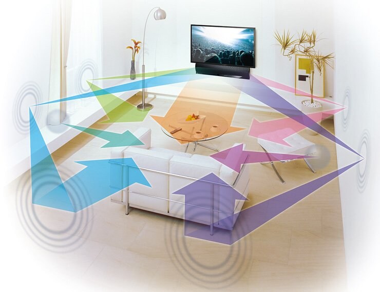 デジタル・サウンド・プロジェクター技術の根幹は、小口径のスピーカーを複数横方向に並べたビームスピーカーと、それらを時間軸で精密に制御するデジタル信号処理技術、この2つで構成されている。横方向に並べた複数のスピーカーから同時に音を出すと、互いの発する音の波が重なり合い、直進方向の強い波が生じる。この直進する音の波、それが音のビームだ。そして各スピーカーから音を出すタイミングをずらすことで、音のビームに方向性が生まれる。「YSPシリーズ」ではこの原理を利用し、高精度なデジタル信号制御によって5つの音のビームを作り出し、これらを壁面に放射・反射させることで、“本当に後ろから音が聴こえる”というリアルな音場空間を作り出している。