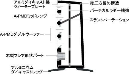 エンクロージュア内部の平行面をなくすとともに、独自のスラントパーティションおよびバーチカルラダー補強を採用することで、音質を損なう定在波や回折現象の低減と、卓越した剛性確保を実現。単に不要共振を抑えるだけでなく、キャビネット外板の“振動”までも高度にコントロールすることで、あらゆるジャンルの音楽をリアルかつ魅力的なサウンドで聴かせます。加えて、キャビネット前面に装着された無垢材削り出しの木製フレア形状ポートがダブルウーファーの量感を最適にコントロールし、切れ味の良いハイクォリティな重低音を再生します。