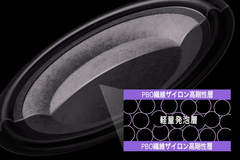 アルモダイナミックライバーに採用された新開発の振動板は、異なる音響特性を持つ素材を組み合わせた独自の3層構造によって、一体化された設計となっています。外層は、高い応答性能と解像度を実現するため、PBO繊維ザイロン、紙、樹脂を配合した高弾性層。内部層には、軽量化と適度な内部損失を両立する、紙と樹脂を配合して発泡させた層を配置。 この軽量発泡層を高弾性層で挟み込む構造により、単一素材・一層構造の振動板では到達し得ない より滑らかで理想的な音響特性を持つ振動板を 実現しました。