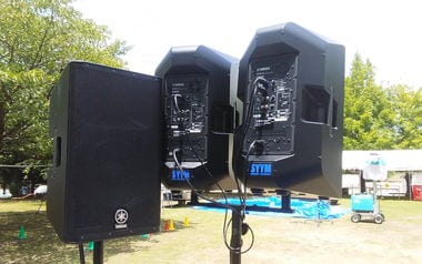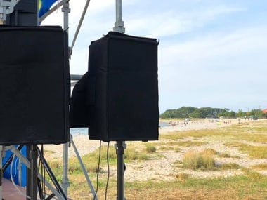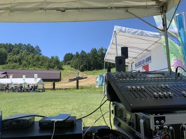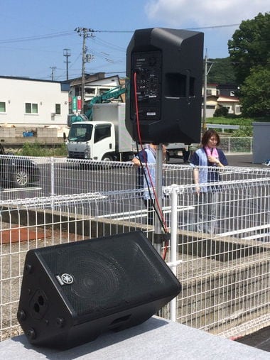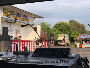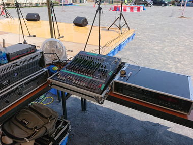 地元の夏祭りの音響だけど、アンプのPX5にスピーカーCBR15をつないだだけで、この屋外会場で使えちゃうんだから効率いいよね。 #PAクールビズ