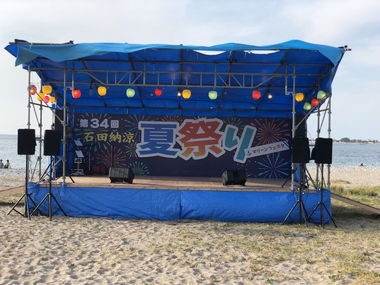 黒部の海で海水浴客を見ながら夏祭り中! 砂浜に熱い音をお届け中してます。 暑過ぎて俺も海に入りたいくらい… #PAクールビズ