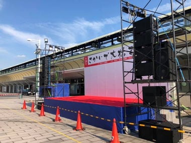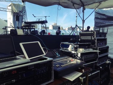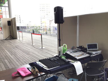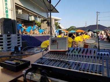 暑い夏の現場の代表格、高知よさこい祭り。まずは中央公園ステージ二階下手側、ポン出しスペース。DXS15+DXR12w/雨カバー。そしてポン出し卓はO1v96i