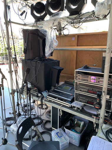 設営完了です。 あっつい!💦15時スタートです。 完全アナログで行きます。 仮設電源、発電機でも安心なヤマハ! #PAクールビズ
