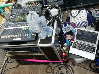 タグ付け忘れてた 先週のほぼ屋外のイベント 扇風機だけじゃ暑すぎました (PCは氷で冷やしてたけど人は…) #PAクールビズ