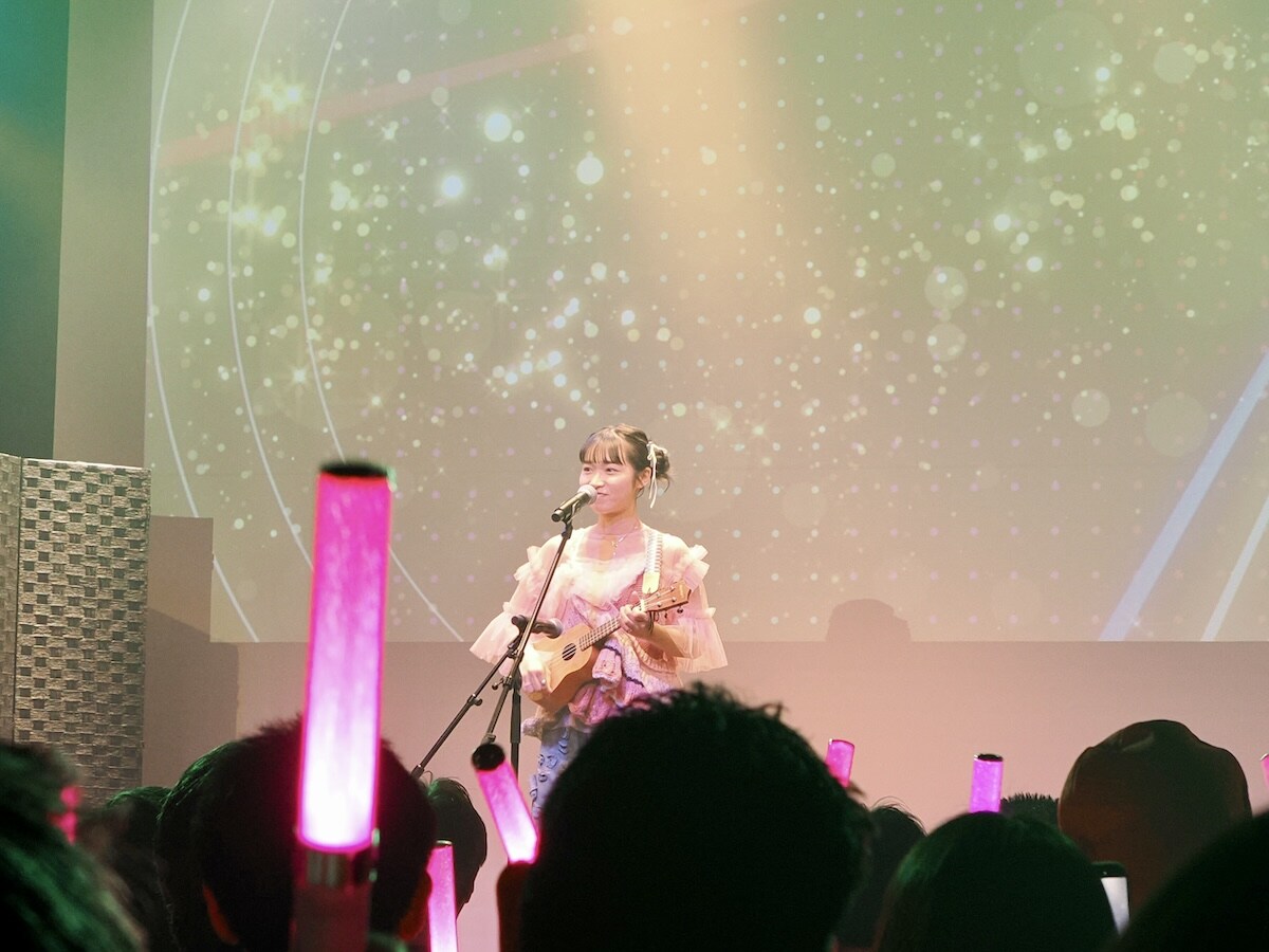 ライブも中盤、ウクレレを持ち登場したのは、イラストや手芸、ウクレレなど多彩な才能を持ち多方面で活躍中の「もちもちもーさん」。つじあやのさんのカバー曲「風になる」をウクレレ演奏と共に披露し会場を盛り上げました。関西女子ならではの、軽快なトークとMCを挟みつつ、ライブ配信でのリスナーさんとの思い出の一曲というBuono!のカバー曲「初恋サイダー」では、会場とのコールアンドレスポンスを交えながら、熱いパフォーマンスを繰り広げました。最後は、今の自分の気持ちとも重なるという西野カナのカバー曲「Always」を熱唱。歌詞の一言一言を大切に届ける姿勢に、会場は静まり返り、誰もが彼女の紡ぐ物語に没入していました。