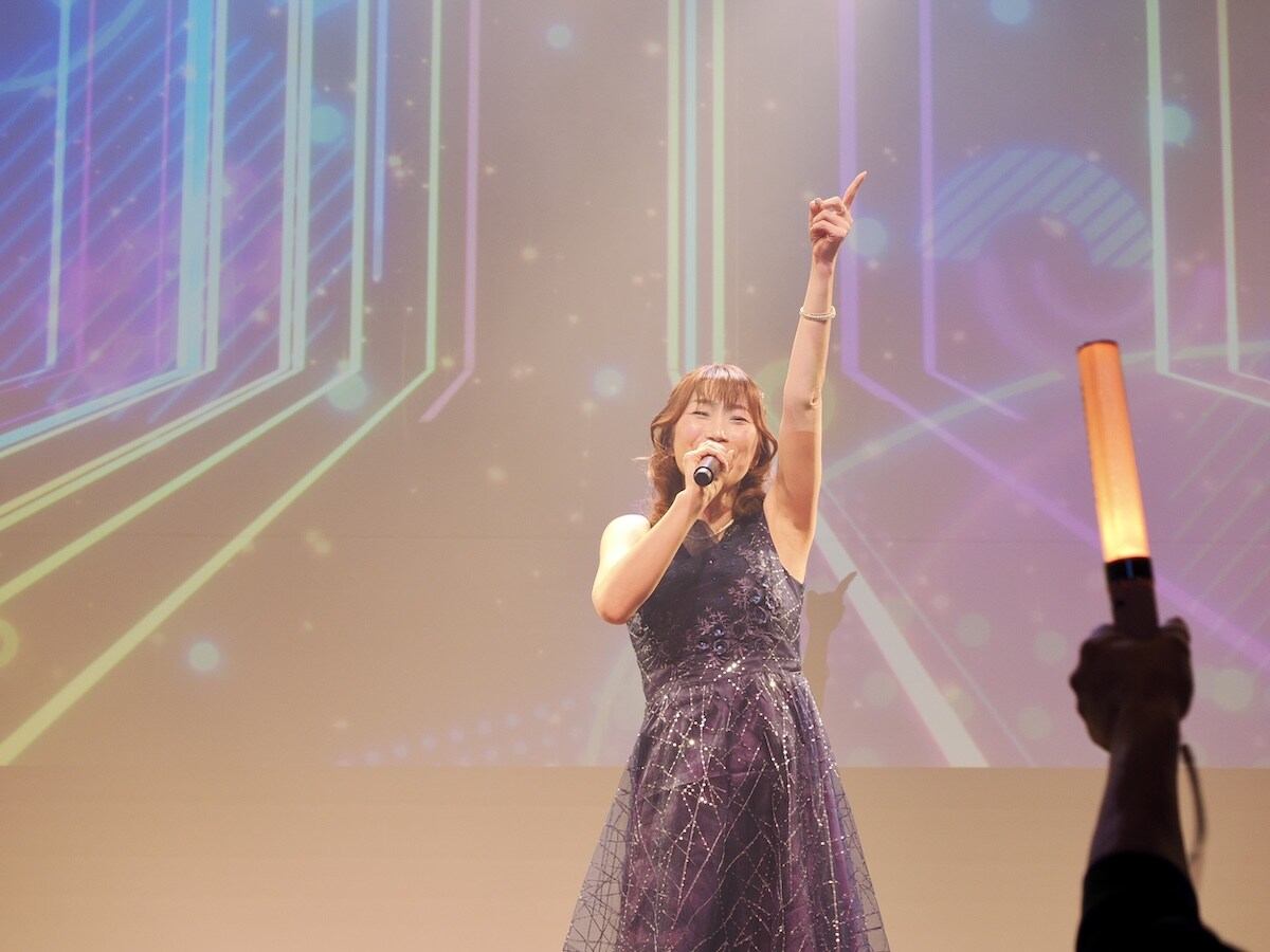 毎日、毎晩、全力疾走で配信を行っているという「おしお」さんは、ステージ映えする華やかな装いで登場しました。リズムに合わせて軽やかにステップを踏み、会場全体を自身の「ホーム」のような空気感に変えてしまいました。