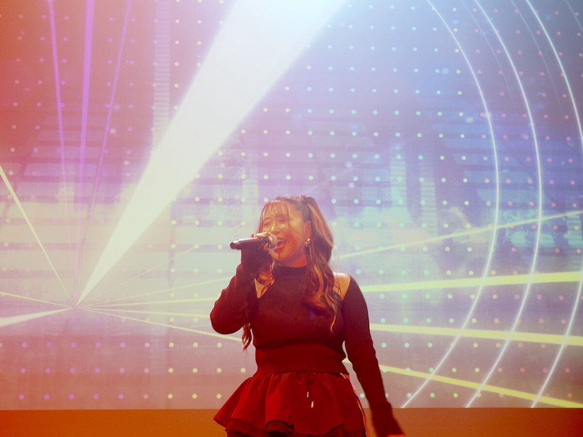 会場の照明が落とされ、しっとりとしたピアノの旋律と共に登場した「鈴木美穂」さん。「鈴木美穂」さんは、2026年でソロ活動20周年を迎え、さまざまなアーティストに歌詞を提供しつつ、オリジナル曲も多数リリースするアーティストです。オリジナルのバラード「花」をしっとりと披露し、観客は一音たりとも聞き逃すまいと静まり返ります。歌詞の一言一言に感情を乗せ、圧倒的な歌唱力でまるで物語を読み聞かせるようなパフォーマンスに、会場のリスナーも深く歌声に聞き入る姿が見られました。続く2曲目では、これまでの静寂から一転、推し活をするリスナーの方を応援するアップテンポなナンバー「L!VE a LIFE」で会場を再び盛り上げ、銀座の洗練された空間は一瞬にしてライブハウスの熱気に塗り替えられました。
