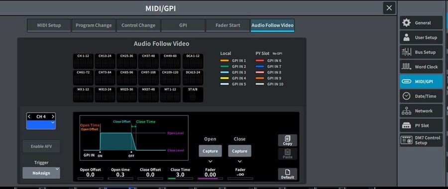 「SETUP」→「MIDI/GPI」→「Audio Follow Video」から設定します。