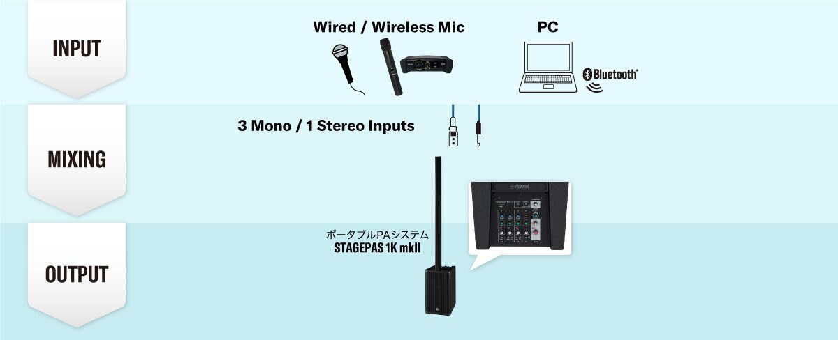 PAに必要な機器がセットになったオールインワンPAシステム「STAGEPAS 1K」。スリムなラインアレイスピーカーは均一な音量・音質を広いエリアに届けます。さらにコンパクトなキャビネットは設置場所を選ばず、見た目にも目立ちません。セットアップは、ラインアレイスピーカーをサブウーファーのキャビネット天面に取り付けるだけで完了。スピーカーケーブルやスピーカースタンドは必要ありません。