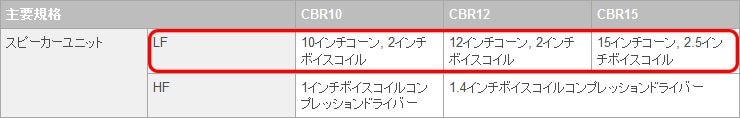 まず、スピーカーの大きさはコンポーネント(Components、またはスピーカーユニット)のLFの項目を見ます。一般的に同じシリーズのスピーカーの場合、口径が大きいほど低域が出やすくなります。