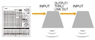 ヤマハのパワードスピーカーDZR、DXR、DBRシリーズの場合は、OUTPUT/THRU/LINK OUTといった名称の端子を使って別のパワードスピーカーを増設することが可能です。なお、DZR、DXR、DBRシリーズの増設はXLR端子のケーブルを使用します。