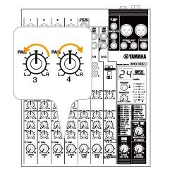 (7) DJミキサーはステレオ出力なのでステレオのイメージを出すために、3チャンネルのPANを左に、4チャンネルのPANを右に回します。(ステレオチャンネルである5/6チャンネルに接続している場合は、すでにPANが左右に振られているので操作する必要はありません。)