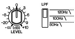 (2) サブウーファーDXS15のレベルを調整します。また、DXR12のHPF(ハイパスフィルター)スイッチの設定に合わせて、サブウーファーDXS15のLPF(ローパスフィルター)スイッチを設定します。