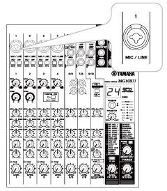 (8) XLRケーブルを使用して、MG10XUのSTEREO OUTとDXR12の「1 MIC/LINE」端子を接続します。
