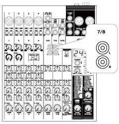 (7) タブレットやスマートフォンなどの再生装置をミキサーの7/8チャンネルにRCAケーブルを使って接続します。