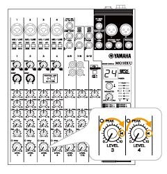 ※DJミキサーをステレオチャンネルである5/6チャンネルに接続している場合、入力GAINの調整はありませんので、音を出してみて音が歪むようであればDJミキサーの出力を下げてください。逆に音が小さいな、と思ったら上げてください。