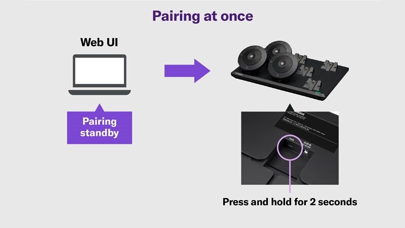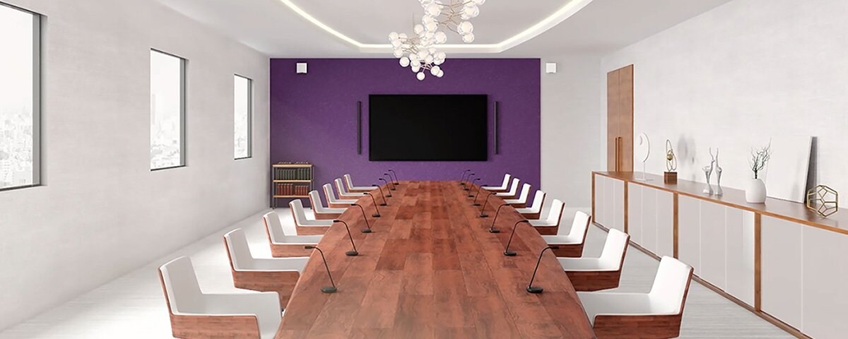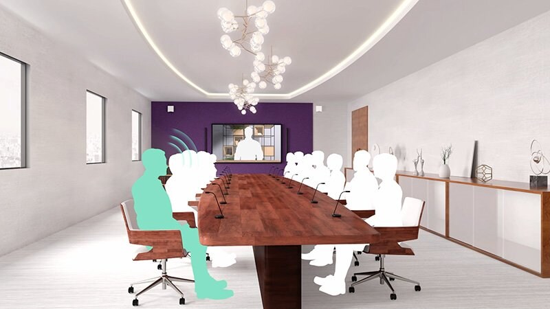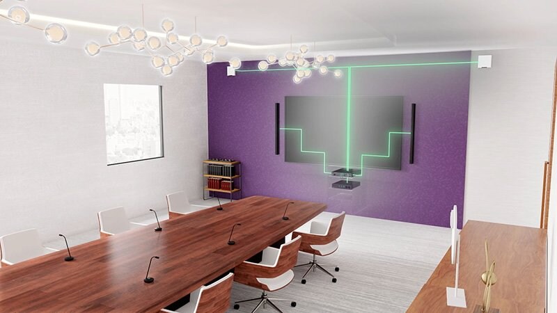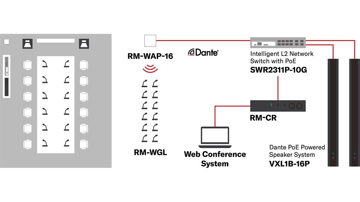 ワイヤレスマイクロフォンシステム(RM-W)、プロセッサー(RM-CR)、ネットワークスイッチ、Dante/PoE対応スピーカー(VXL1-16P・VXC2P)が、シームレスに連携し、遠隔会議に最適な音環境を構築します。