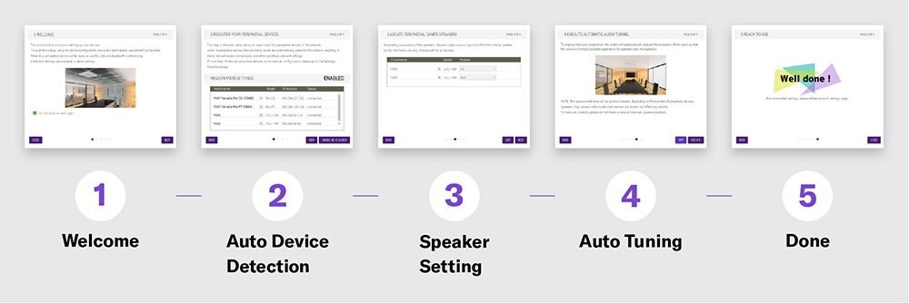 システムはすべての機器を自動検出し、スピーカーやマイクの位置、残響特性、エコーなど部屋の環境に合わせて最適化します。設定は案内に沿って4つのステップを進めるだけで完了します。