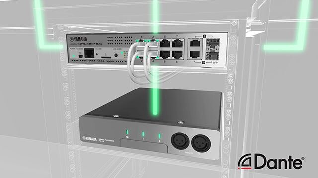 オーディオネットワーク規格「Dante」を使用することで、1本のネットワークケーブルで音声・制御信号を伝送できます。そのため、複雑な配線作業など設置時の負担を大幅に削減します。