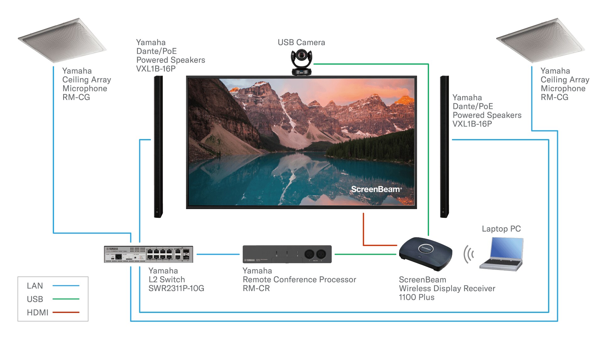 ヤマハ『RM-CG』、ScreenBeam社『1100 Plus』による遠隔会議システム例