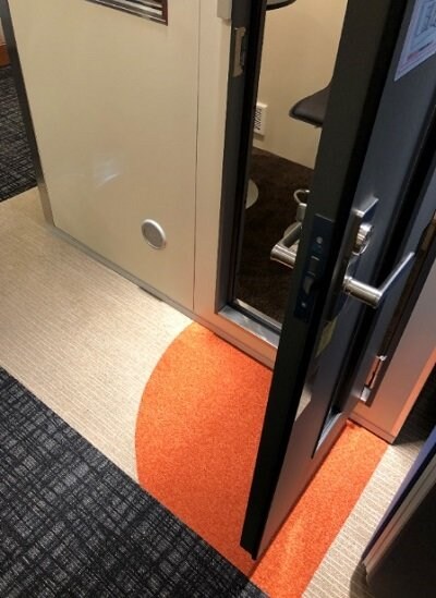 今回は室外床カーペットで、 ドアを開けた際に人とぶつからなうように注意喚起の工夫をしました。