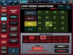 LOOP REMIX機能を用いて、選択されたフレーズを指定した間隔で分断して並べ替え、ロールやブレークの挿入を自動的に行い、新しいフレーズに作り替えることが出来ます。V2.0では1フレーズに対して2種類のLOOP REMIX機能が設定可能になりました。
