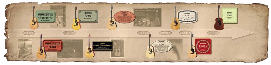 FG180、FG150をリリースした1966年からヤマハFGシリーズの歴史は始まりました。ヤマハFG誕生から50年。たゆまぬ技術の向上によりモデルチェンジを重ね、その時代の音楽シーンに一番合うFGを制作。200を超えるモデルを世に送り出しています。