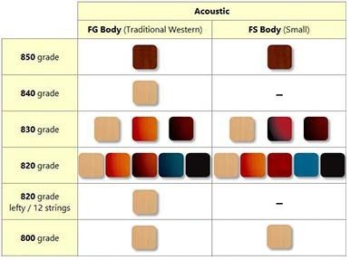 ウェスタンタイプボディのFGシリーズと、コンパクトなボディシェイプのFSシリーズ。2つの胴型と、表・裏・側板に異なる木材を採用した5つのグレードに、多彩なカラーバリエーションの中から自分好みのモデルを選択可能。多様な音楽ニーズに応えるラインナップです。