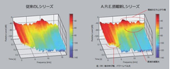 掲載のグラフは、現行品LシリーズとA.R.E.搭載のNew Lシリーズを一定の条件下において発音させた、音響スペクトルの実測グラフィックデータです。A.R.E.搭載のギターにおいて、低域のサステインが増大し、高域のアタック感が良くなっていることが見てとれます。またアタックの後、耳障りな高域成分がより短時間で減衰していることも明らかです。A.R.E.で狙った音響特性変化が数値的にも裏付けられていると考えられます。