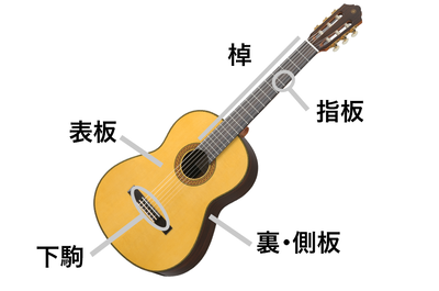 合板:複数枚の木材でできています。音響特性は単板に劣りますが、強度的には合板の方が優れています。CG102の表板は合板です。また、CGシリーズの裏側板はすべて合板です(GCシリーズは表板も裏側板も単板です。)