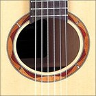 サウンドホールのインレイは、マホガ ニー材とパドック材にアバロン貝をあ しらった上品かつモダンなデザイン。NCXが真円型に対して、NTXは楕円型のデザインです。