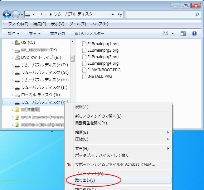 (7)正しくコピーされていたら、USBフラッシュメモリーを取り出します。