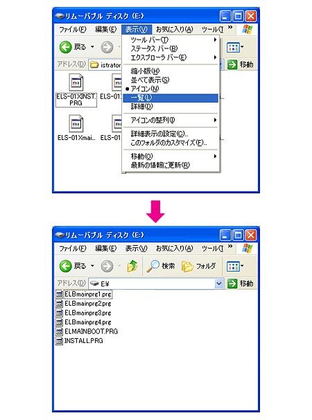 コピーに成功している場合、USBフラッシュメモリーが開いた直後に、必要なファイル6個が表示されます。解凍されたフォルダーを開き 表示 → 一覧 で並べ替えた後、バージョンアップに必要なファイル一覧と見比べてご確認ください。