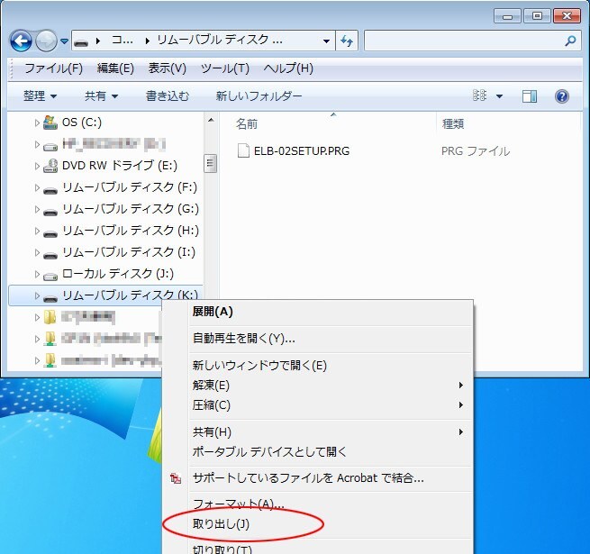 「リムーバブルディスク」をクリックして、「取り出し」を選択して、USBフラッシュメモリーを取り出してください。