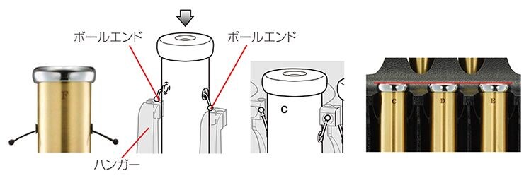 ワイヤーのボールエンドをハンガーの溝に合わせて引っ掛けるだけの新機構により、CH-500では⾮常に煩わしかった⾳管の取り付けがやりやすくなりました。この吊りシステムにより⾳管が⽔平⽅向にきれいに整列し、演奏しやすくなります。 ワイヤー交換にも⼯具は必要ありません。