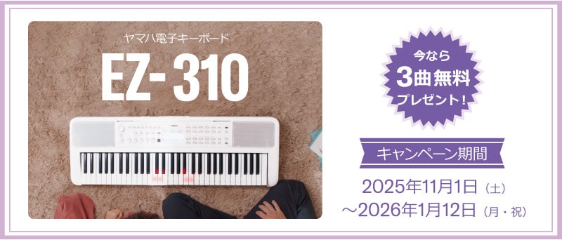 期間中にヤマハ電子キーボードEZ-310を購入された方全員に、ヤマハミュージックデータショップでお好きな3曲を無料プレゼント