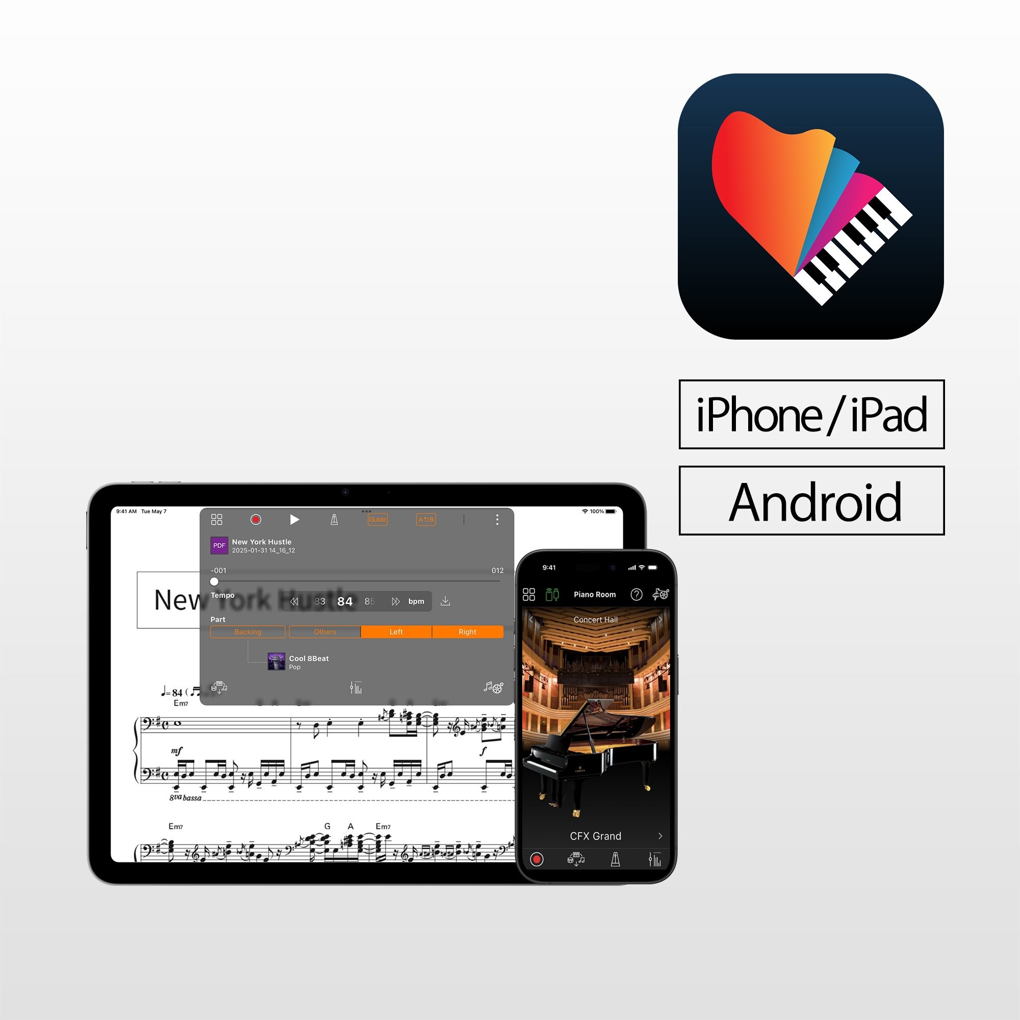 市販のPDF楽譜を追加して、楽譜を表示しながら演奏したり、自動生成された参考演奏を聴くこともできます。*