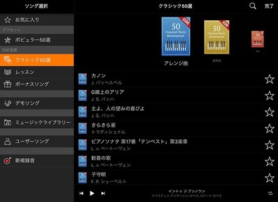 さらに、バイエル、ブルグミュラー、チェルニー、ハノンなどのレッスン曲のPDF楽譜をダウンロードして、表示することができます。